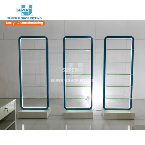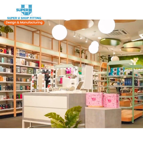 رف عرض معدني عصري لمتاجر التجميل بتصميم داخلي على أحدث صيحات أثاث متاجر التجميل رف عرض زجاجي مخفف في الصيدلية